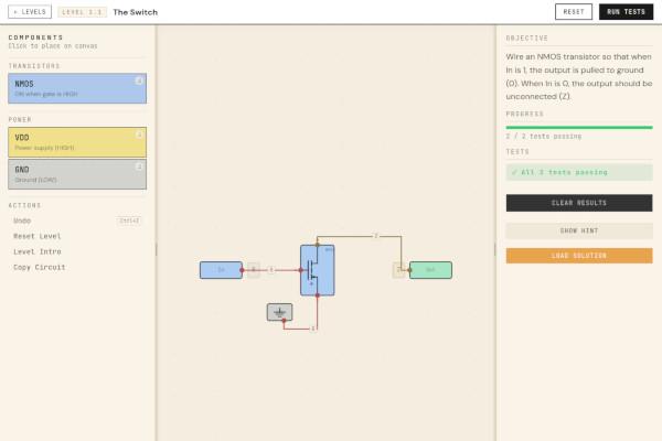 The game, played in-browser, starts with a memo from “Mvidia’s” chief exec, explaining that despite having been hired as a software engineer you’re being shunted across to working on the company’s hardware - starting at the very fundamental level of using NMOS and PMOS transistors to make a switch. These are then combined to create a NAND gate, then AND, OR, XOR gates, then the player moves on to making arithmetic and logic units to create a functional processor.